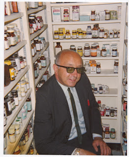 Fred Carcello, Pharmacist and Owner of Mission Drugs, located on the north-west corner of Mission and Bay Streets in Santa Cruz. It was favorite place for Italians living on Santa Cruz's North Coast to go to for their pharmaceutical needs. [La Nostra Costa (Our Coast), page 194]